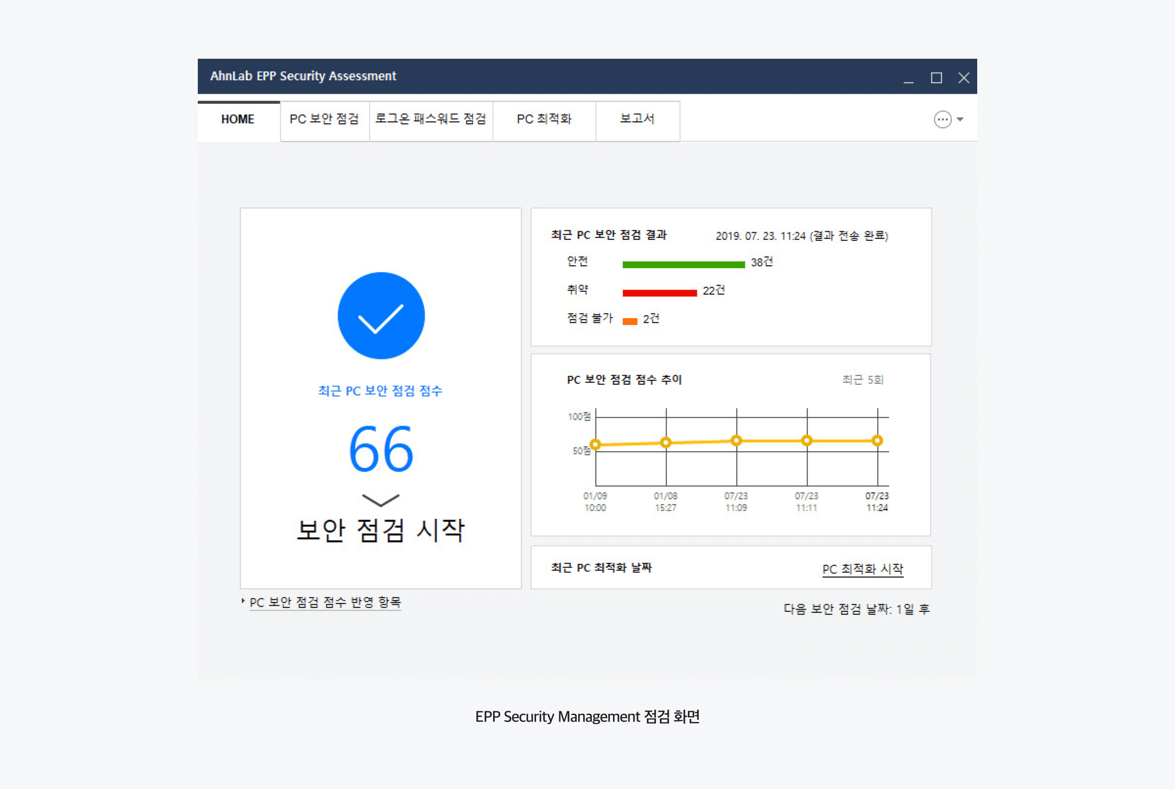 EPP Security Assessment는 보안 상태를 점검 및 감사하여 자동조치를 통해 엔드포인트의 전반적인 보안 수준을 강화(hardening)하는 취약 시스템 점검 및 조치 솔루션입니다.
