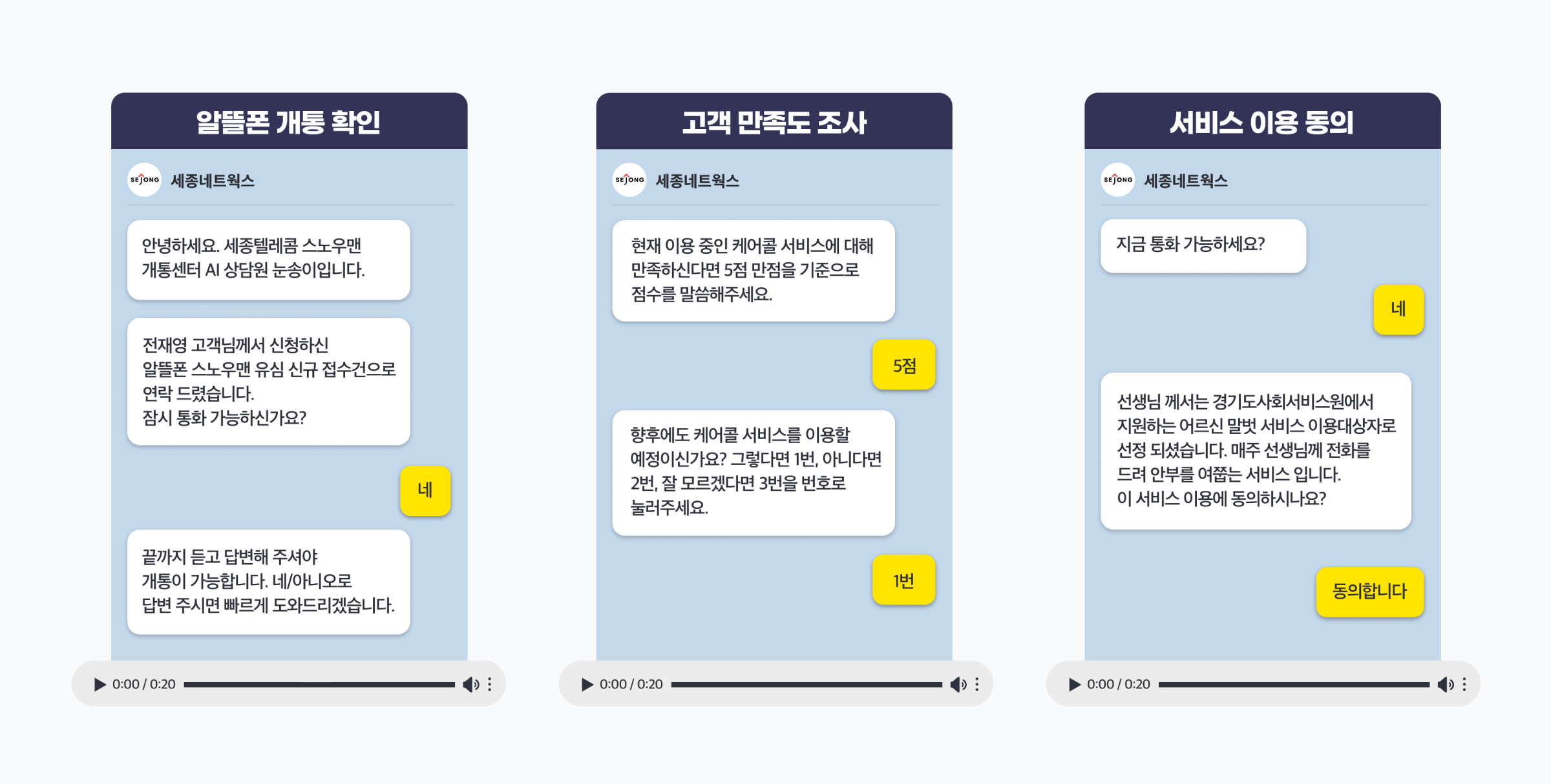 • AI와 대상자간 통화 녹음 확인 및 상담내용을 텍스트로 변환한 메시지창 확인 가능