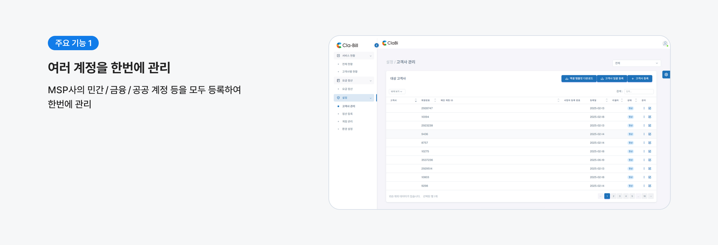 설정 고객사 관리 •고객사 등록 및 일괄 등록을 위한 템플릿 제공