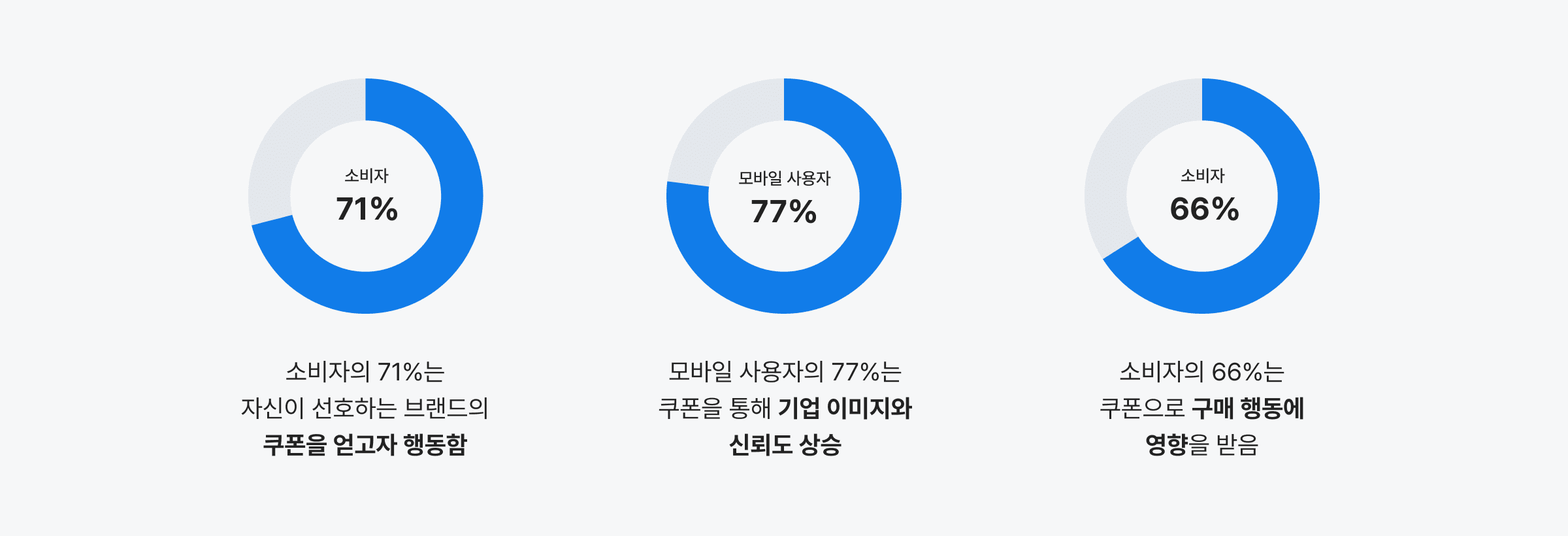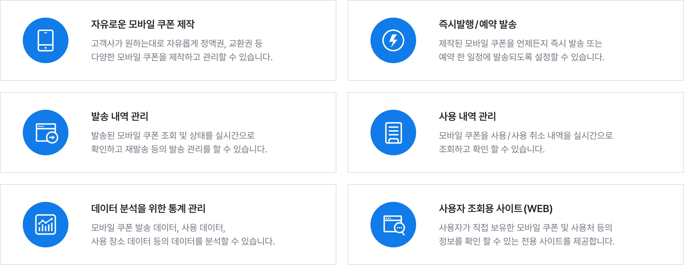 모바일 쿠폰 발송을 위한 자유로운 쿠폰 제작과 즉시 발송, 예약 발송, 연동 발송 등의 서비스를 제공합니다.